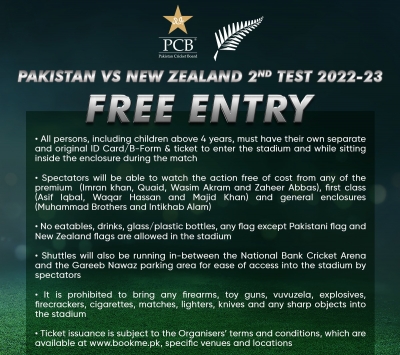टेस्ट मैच देखने के लिए इच्छुक दर्शकों को प्रवेश के लिए अपना मूल सीएनआईसी या बी फॉर्म लाने की जरूरत होगी। वे किसी भी स्टैंड से नि:शुल्क मैच देख सकेंगे।