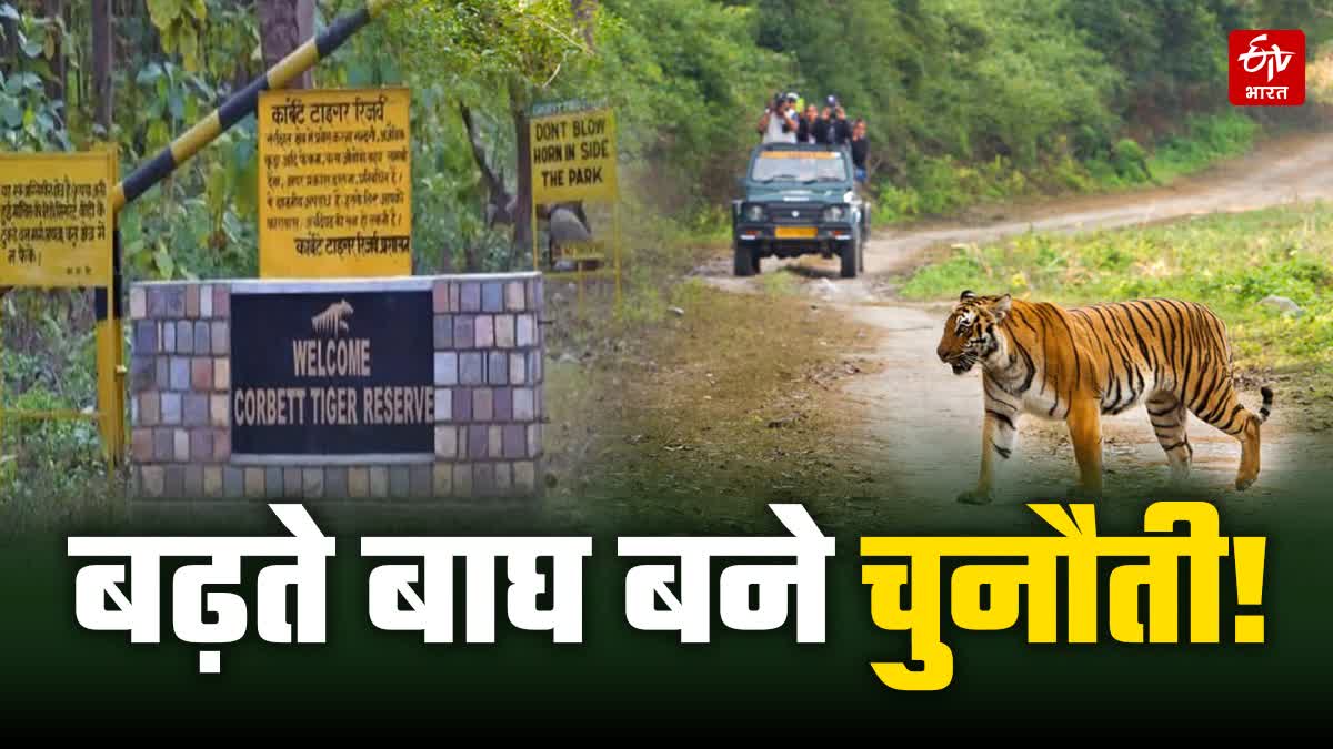कॉर्बेट टाइगर रिजर्व हुआ ओवरलोड: टाइगर इस्टीमेशन रिपोर्ट 2023 की मानें तो सीटीसी यानी कॉर्बेट टाइगर रिजर्व में 5 से 7 वर्ग किलोमीटर वर्ग किलोमीटर एरिया में ही बाघ सरवाइव कर रहे हैं. बाघों की टेरिटरी के लिहाज से वैज्ञानिक बताते हैं कि एक वयस्क बाघ को औसतन 20–25 वर्ग किलोमीटर क्षेत्र की आवश्यकता होती है, लेकिन कॉर्बेट टाइगर रिजर्व में हालात बिल्कुल अलग हैं.